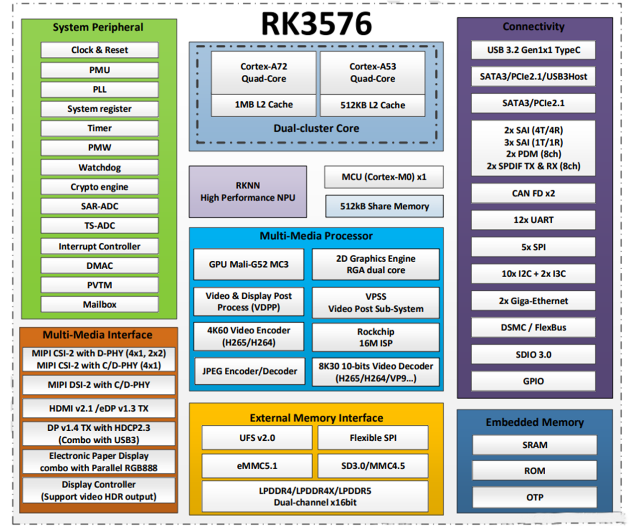 RockChip RK3576 A plataforma AIOIT de alta geração de 8nm de 8nm é um processador SoC de baixa e baixa potência (sistema no chip) adequado para uma variedade de cenários de aplicativos, como PCs baseados em ARM, dispositivos de computação de borda e dispositivos de Internet móvel pessoal. Ele usa uma CPU de oito núcleos com base na arquitetura do ARM, integra uma NPU independente de 6tops (operações da TERA por segundo) (unidade de processamento de quádruplos de rede neural), integra vários núcleos de computação, como GPU, MCU, VPU, e possui uma rica interface periférica para atender aos requisitos complexos de cena em muito. Além disso, o RK3576 também suporta o UFS (Storage Universal Flash Storage), fornecendo recursos eficientes de armazenamento de dados e leitura.