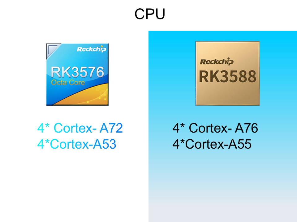 Desempenho da CPU: o RK3588 usa o Cortex-A76 + Quad-Core Cortex-A55, enquanto o RK3576 usa o CortexA72 + Quad-Core Core53, com considerações de custos e estão equipadas com o coprocessador do ARM Cortex M0, que reúne mais possibilidades a aplicações relacionadas.
