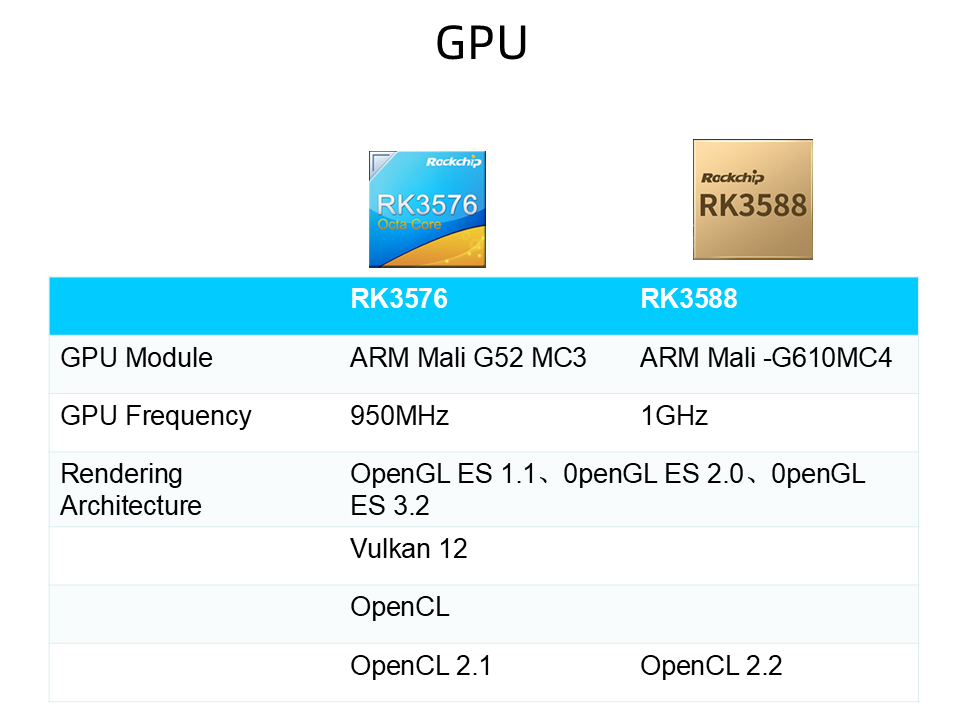 Ambos suportam o OpenG ES 1.1, 2.0 e 3.2, Vulkan 1.2, mas o RK3588 é maior na versão OpenCL (o RK3588 suporta 2.2).