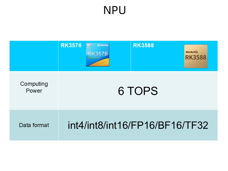 RK3588 e RK3576 estão equipados com poder de computação 6tops, suportar formatos de dados como Int4int8/Int16/FP16/BF16/TF32 e são adequados para uma variedade de aplicativos AI cenários.