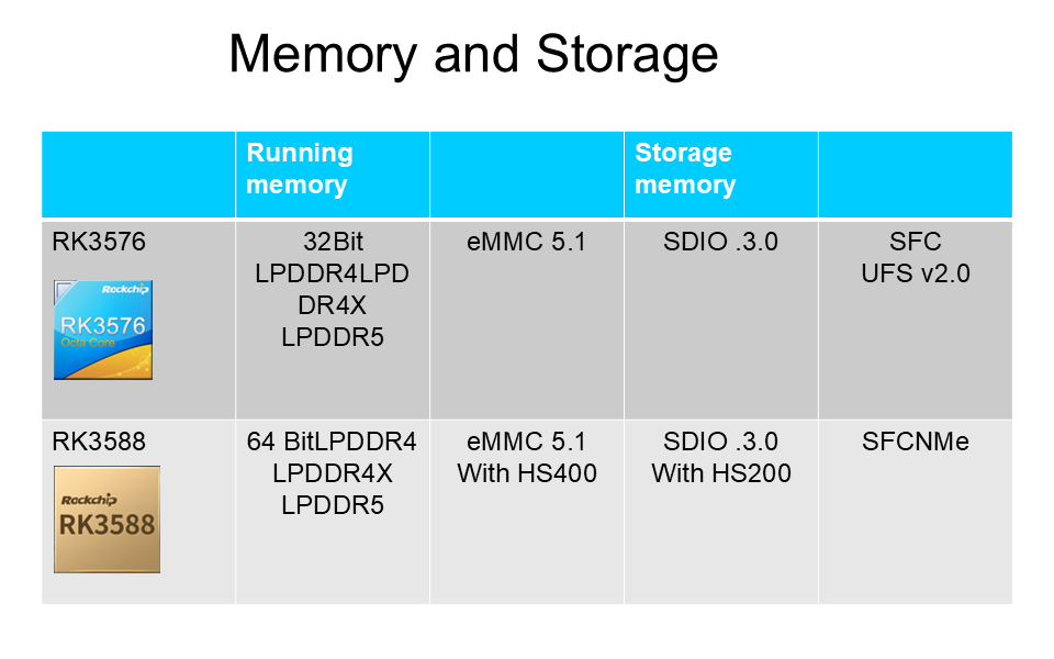 RK3588 suportes64 bitsLPDDR4/LPDDR4X/LPDDR5, EMMC5.1: com HS400, SDI03.0 com HS200 e NME e SFC. Os dois são diferentes na largura do bit de dados de memória (64 bits vs. 32 bits).