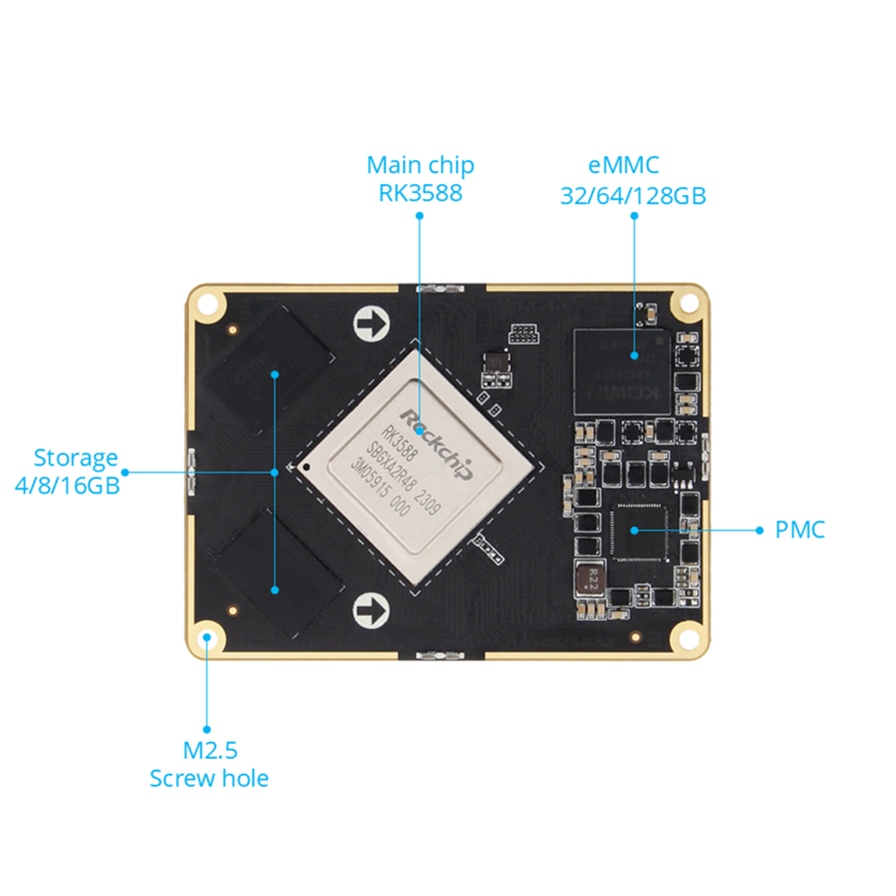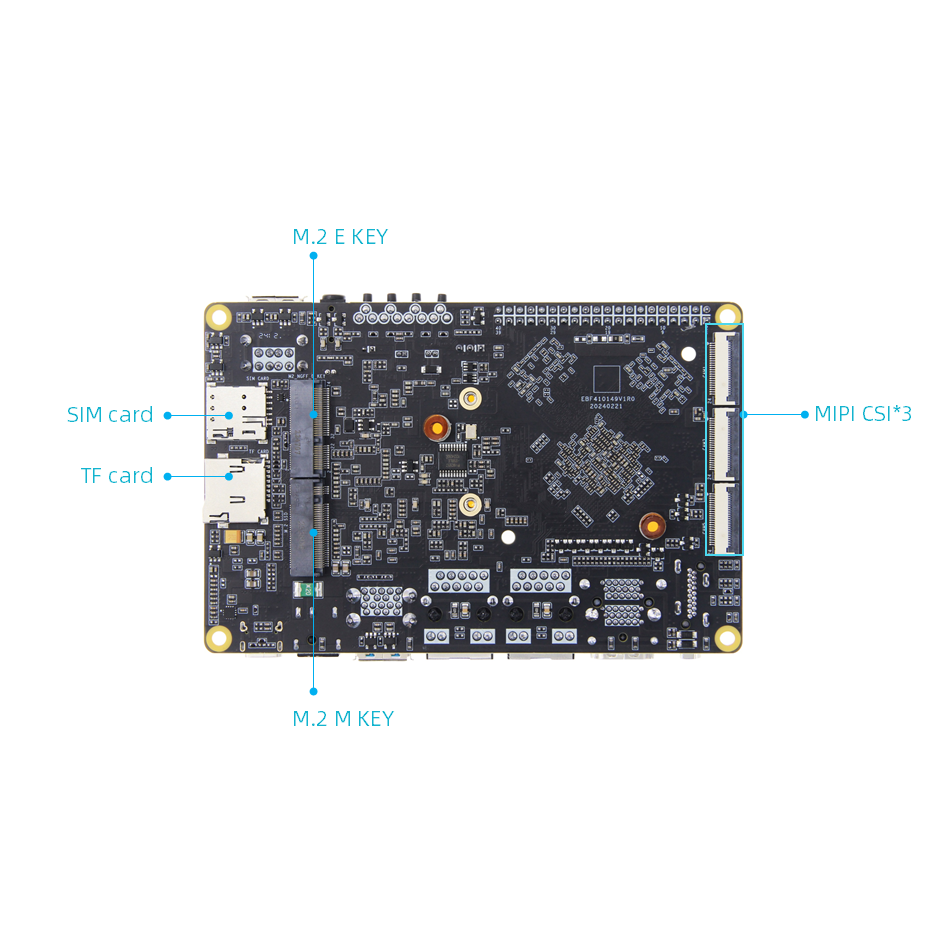 • Configuração principal: 16 GB LPDDR5 RAM + 128 GB eMMC, duas portas Gigabit Ethernet, duas portas USB 2.0, duas portas USB 2.1, seis portas MIPI CSI, duas portas MIPI DSI, interface Mini-PCle (suporta placas de rede Wi-Fi, módulos 4G, módulos 5G ou outros módulos de interface Mini-PCle), porta de expansão de 40 pinos (compatível com a porta Raspberry Pi de 40 pinos, compatível com PWM, GPIO, PCI Express, SPI, UART e CAN), M.2 M-KEY compatível com SSDs M.2